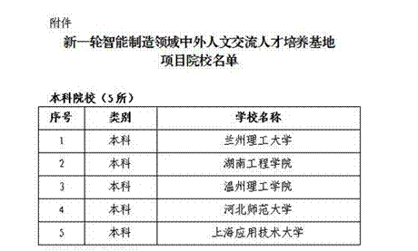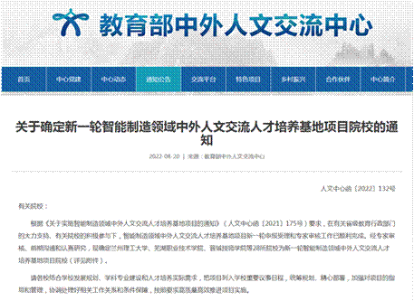 近日,从教育部中外人文交流中心发布的《关于确定新一轮智能制造领域中外人文交流人才培养基地项目院校的通知》获悉,全国遴选了5所本科院校、19所高职院校和4所中职学校为新一轮智能制造领域中外人文交流人才培养基地项目院校,我校作为本科院校组成功入选。