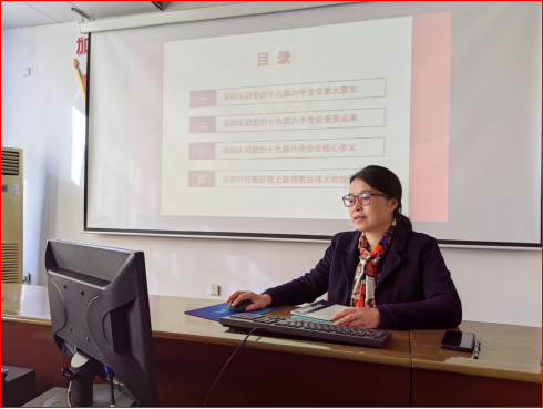 会上,肖江淑书记以《党的十九届六中全会的重要成果和核心要义》为主题,给中心组全体成员上了堂生动的党课。随后,中心组成员围绕学习主题进行了研讨。