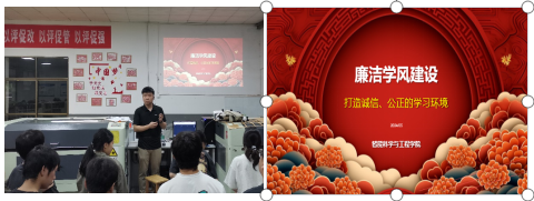 廉洁文化宣传,提高学院形象,形成示范效应。在课堂中融入廉洁文化宣讲,分享廉洁学风建设警示案例,引发学生的共鸣和思考。通过案例,引导学生们认识到廉洁学风的重要性及它对于个人发展和社会进步的深远影响。