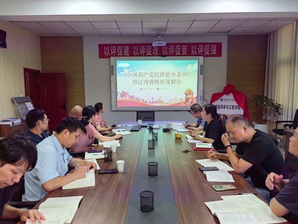 会上,学院院长、党委副书记胡慧逐条领学了《中国共产党纪律处分条例》(下简称《条例》)的第四、五章内容。学院副院长、教工一支部书记胡晓东围绕“党纪学习教育是什么?学什么?怎么学?”这一主题,从党纪学习教育的开展时间、重要意义、开展目的、目标要求、学习重点和工作要求等六个方面阐述了党纪学习教育的重要性及学习方法。教工二支部书记刘美华则以归纳的形式,对《条例》中新修订的与我们日常生活和工作紧密相关的14项内容进行了梳理与解读。随后,与会党员围绕新修订的《条例》进行了深入地研讨与交流。最后,全体党员观看了高校党组织示范微党课《中华传统廉洁文化》。