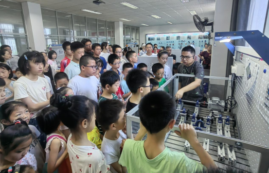 活动中,孩子们在老师的带领下,认识了现代钳工设备、数控加工设备、智能产线等先进制造设备,了解到它们的发展历程、加工原理和工作流程。