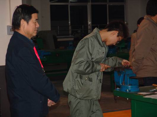 11月13日晚19:00,评估专家李正熙、陈文哲两位教授来到工程训练中心对抽查到的同学进行技能测试,两位教授仔细查看了同学们的数控车、车工、钳工等技能测试情况,在查看中还详细地询问了指导老师和被抽查的同学。省教育厅处长王文斌在副院长刘国繁教授的陪同下,也来到工程训练中心,对考场进行了巡视。