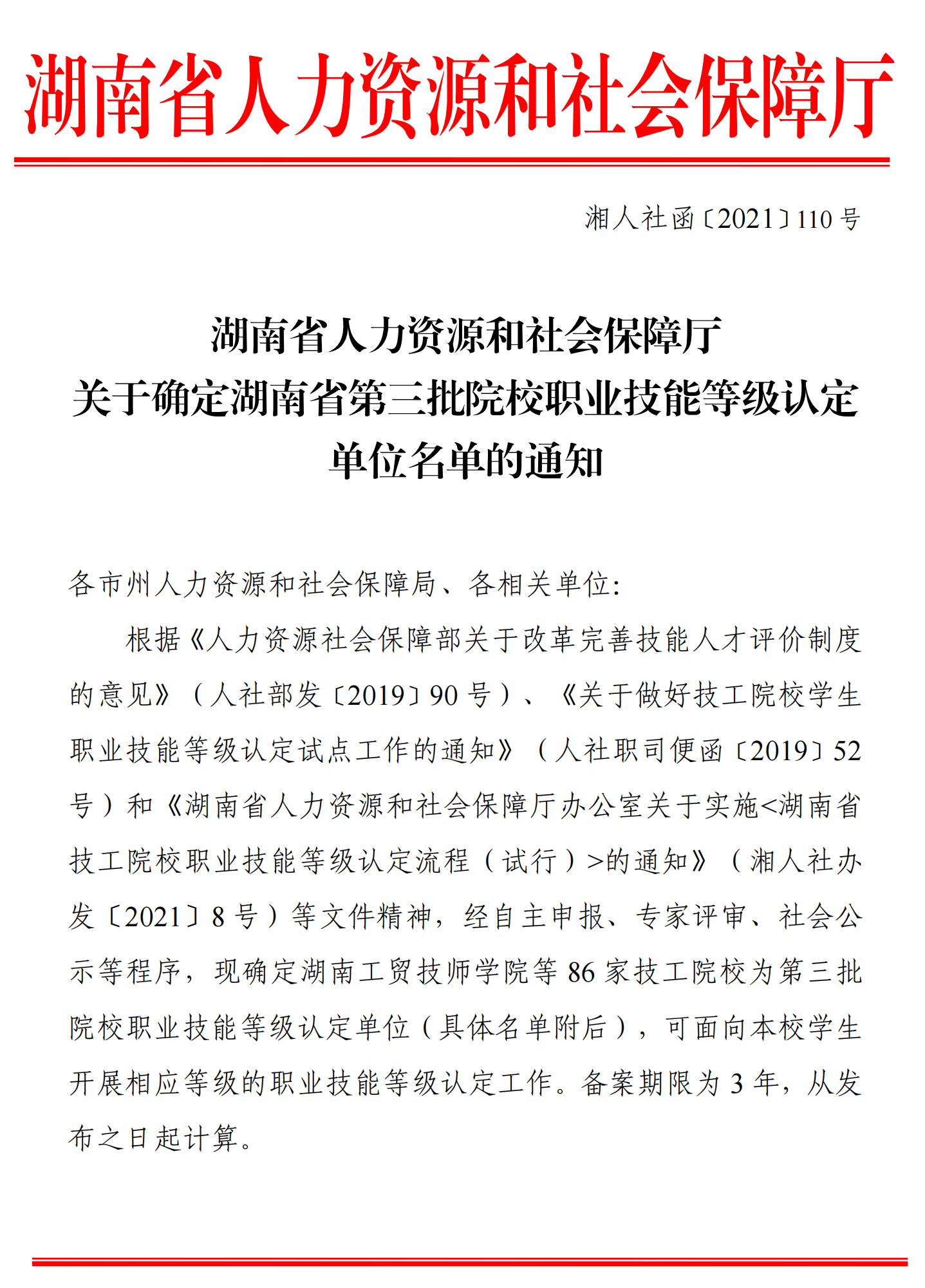 湘人社函〔2021〕110 号 关于确定湖南省第三批院校职业技能等级认定单位名单的通知