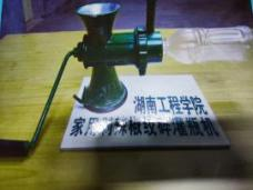 该作品采用市场上家用绞碎机为样机。它主要包括机体、螺杆、手柄、推进轴、吸盘、灌瓶装置(圆锥螺杆)、圆刀、十字刀片、加盐装置、出料筒组成。结构形式的选择取决于原料供料的要求。整个传递运动过程中螺杆是家用剁辣椒绞碎自动灌瓶机的主要执行部件,是关键机构,它的主要任务就是将十字刀片、圆刀和圆锥螺杆连接在一起,形成一个整体传动轴。辣椒由投料口输入,通过作用手柄带动螺杆旋转,从而把辣椒输送到十字刀片处,由于螺杆旋转时,十字刀片也随螺杆旋转,圆刀固定不动。从而把辣椒绞碎,并从圆刀孔中流出。流出的辣椒颗粒经过加盐后,再通过圆锥螺杆的输送,灌入瓶中。物料随圆柱形螺旋杆不断填充,刀具进行切碎,压环装置进行加盐,锥形螺杆输送,最后由出料筒落入容器瓶中。 |