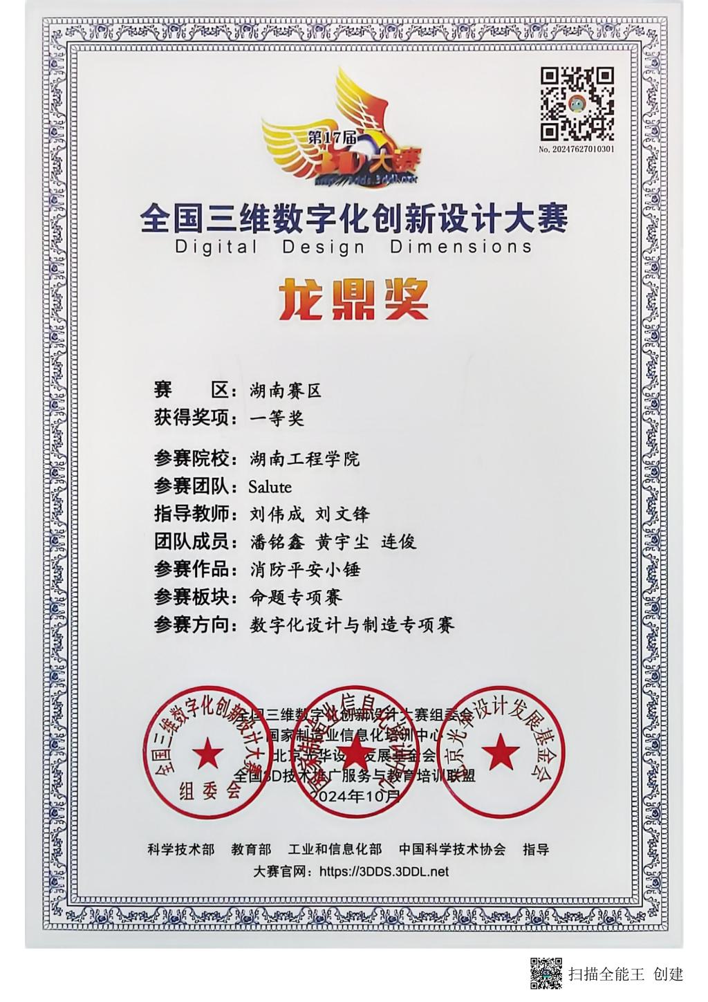 全国三维数字化创新设计大赛“龙鼎奖”湖南赛区一等奖